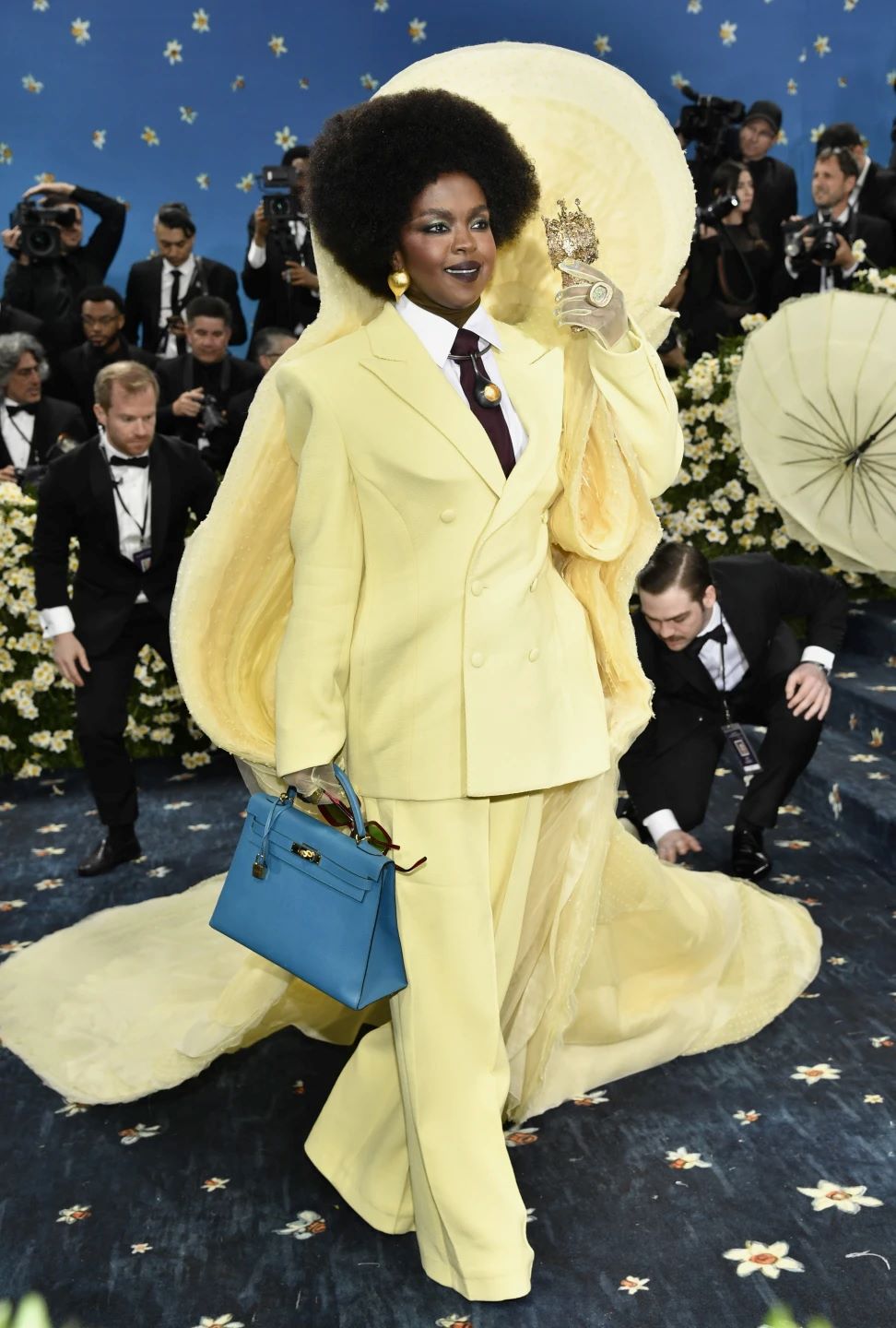 Η Lauryn Hill τίμησε την ανδρική ραπτική με ένα κοστούμι σε απαλό κίτρινο και έντονες ραφές.