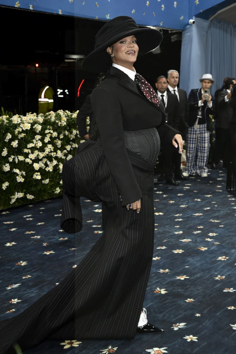 Η Rihanna, πιστή στην παράδοση να εμφανίζεται τελευταία, περπάτησε στο χαλί φορώντας ένα εντυπωσιακό pinstripe σύνολο Marc Jacobs με τεράστιο καπέλο και τα μανίκια ενός ανδρικού κοστουμιού δεμένα σαν μπουφάν στην πλάτη της. Το νεοανακοινωθέν τρίτο της παιδί έδωσε ακόμα μεγαλύτερη λάμψη στην εμφάνισή της.