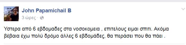 “Ύστερα από 6 εβδομάδες στα νοσοκομεία, επιτέλους είμαι σπίτι. Ακόμα βέβαια έχω πολύ δρόμο, άλλες 6 εβδομάδες, θα περάσει που θα πάει”, έγραψε στο Facebook.