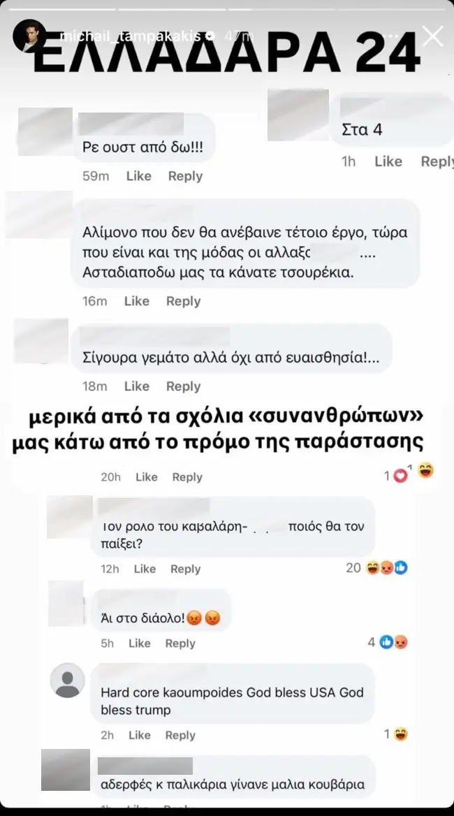«Ελλαδάρα 2024» έγραψε ο Μιχαήλ Ταμπακάκης, με την επισήμανση «μερικά από τα σχόλια ‘συνανθρώπων’ μας κάτω από το πρόμο της παράστασης».