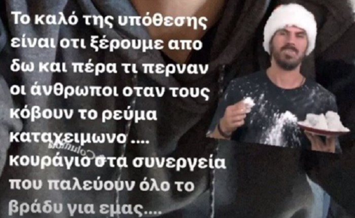 «Ακόμα μία μέρα χωρίς ρεύμα. Το καλό της υπόθεσης είναι ότι από εδώ και πέρα ξέρουμε τι περνάνε οι άνθρωποι όταν τους κόβουν το ρεύμα μέσα στον χειμώνα. Κουράγιο στα συνεργεία που παλεύουν όλο το βράδυ για εμάς».