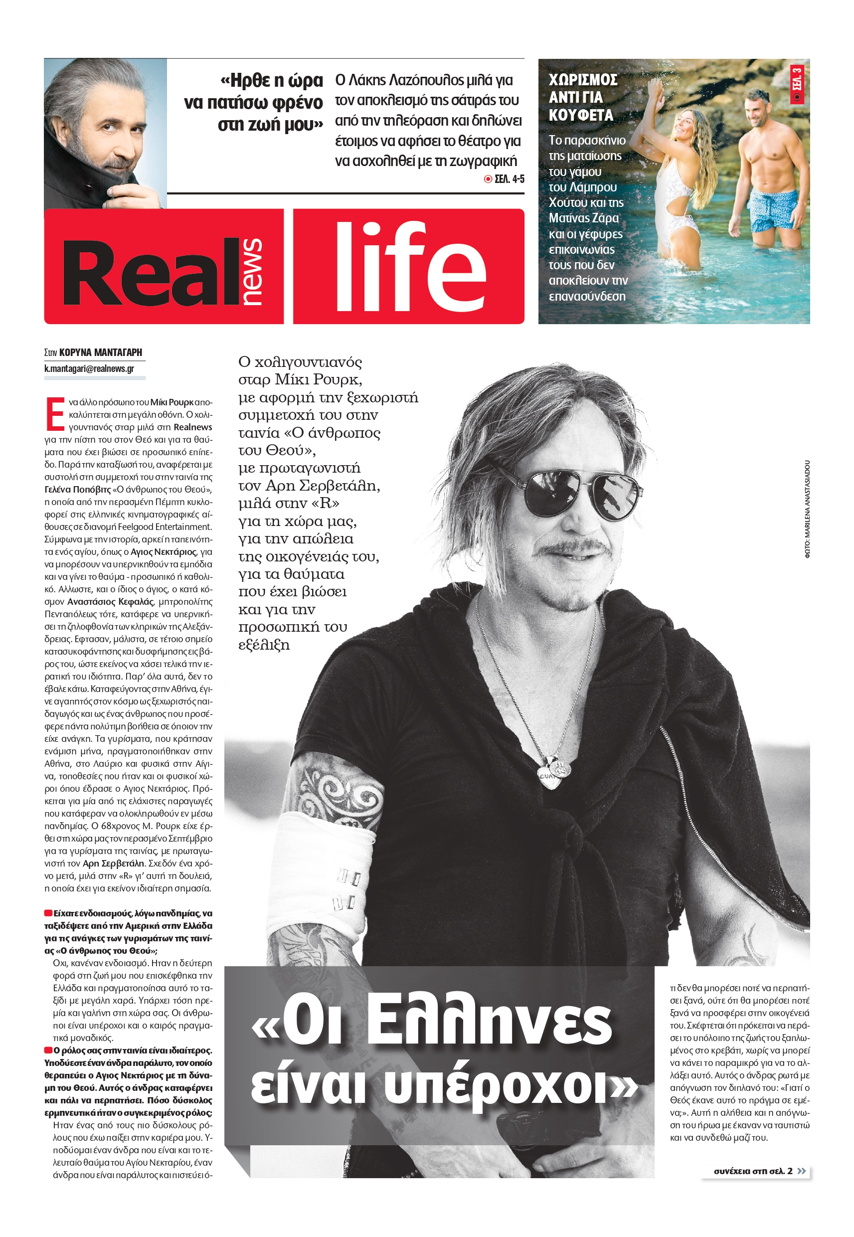 Ο xολιγουντιανός σταρ Μίκι Ρουρκ, με αφορμή την ξεχωριστή συμμετοχή του στην ταινία «Ο άνθρωπος του Θεού», με πρωταγωνιστή τον Άρη Σερβετάλη, μιλά στη Realnews για τη χώρα μας, για την απώλεια της οικογένειάς του, για τα θαύματα που έχει βιώσει και για την προσωπική του εξέλιξη.