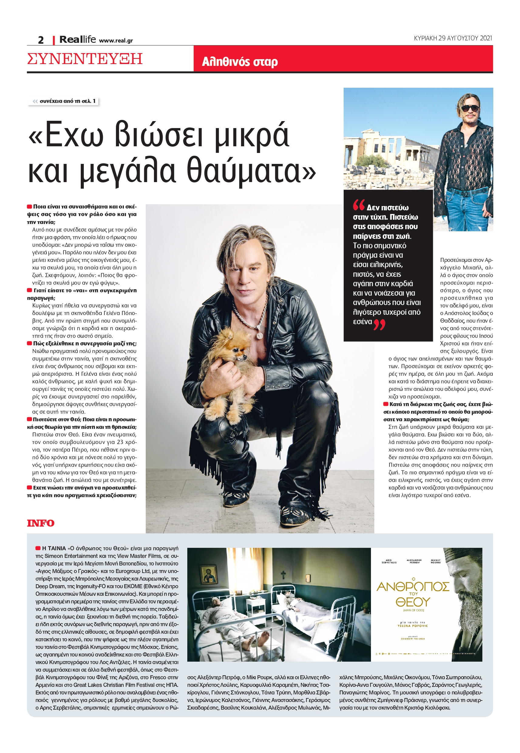 Ο χολιγουντιανός σταρ μιλά στη Realife για την πίστη του στον Θεό και για τα θαύματα που έχει βιώσει σε προσωπικό επίπεδο. Παρά την καταξίωσή του, αναφέρεται με συστολή στη συμμετοχή του στην ταινία της Γελένα Ποπόβιτς «Ο άνθρωπος του Θεού», η οποία από την περασμένη Πέμπτη κυκλοφορεί στις ελληνικές κινηματογραφικές αίθουσες σε διανομή Feelgood Entertainment.