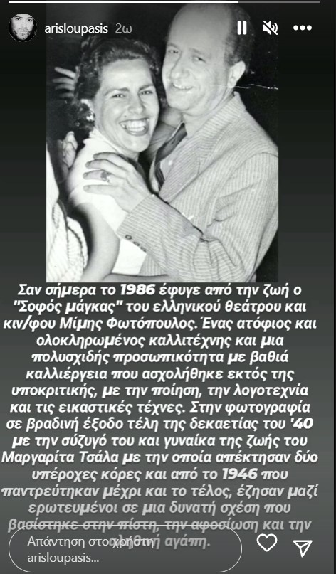 «Σαν σήμερα το 1986 έφυγε από τη ζωή ο “Σοφός μάγκας” του ελληνικού θεάτρου και κινηματογράφου Μίμης Φωτόπουλος. Ένας ατόφιος και ολοκληρωμένος καλλιτέχνης και μια πολυσχιδής προσωπικότητα με βαθιά καλλιέργεια που ασχολήθηκε με την ποίηση, τη λογοτεχνία και τις εικαστικές τέχνες.