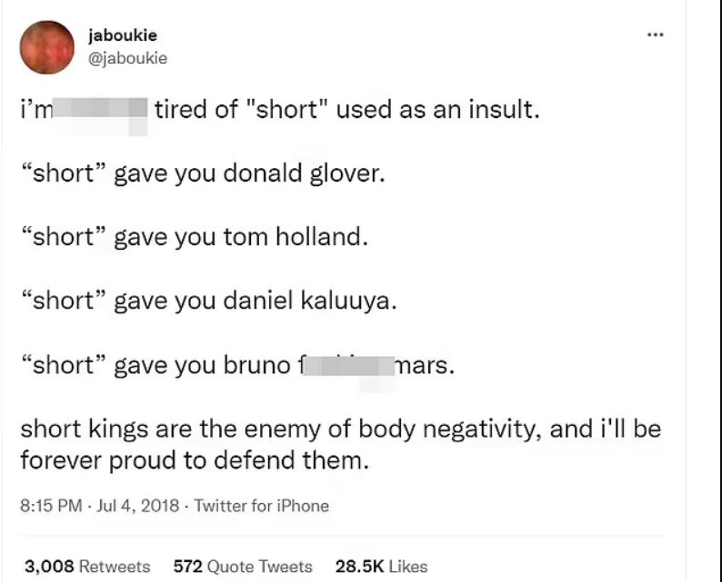 Φέρεται η μόδα για τους κοντούς άνδρες να ξεκίνησε το 2018, όταν ο κωμικός Jaboukie Youyng-White να έκανε μια σχετική ανάρτηση στο twitter, γράφοντας “έχω κουραστεί να χρησιμοποιείται το “κοντός” σαν προσβολή. “Κοντός” σου έδωσε τον Ντάνι Γκλόβερ, τον Τομ Χόλαντ, τον Ντάνιελ Καλούγια”.