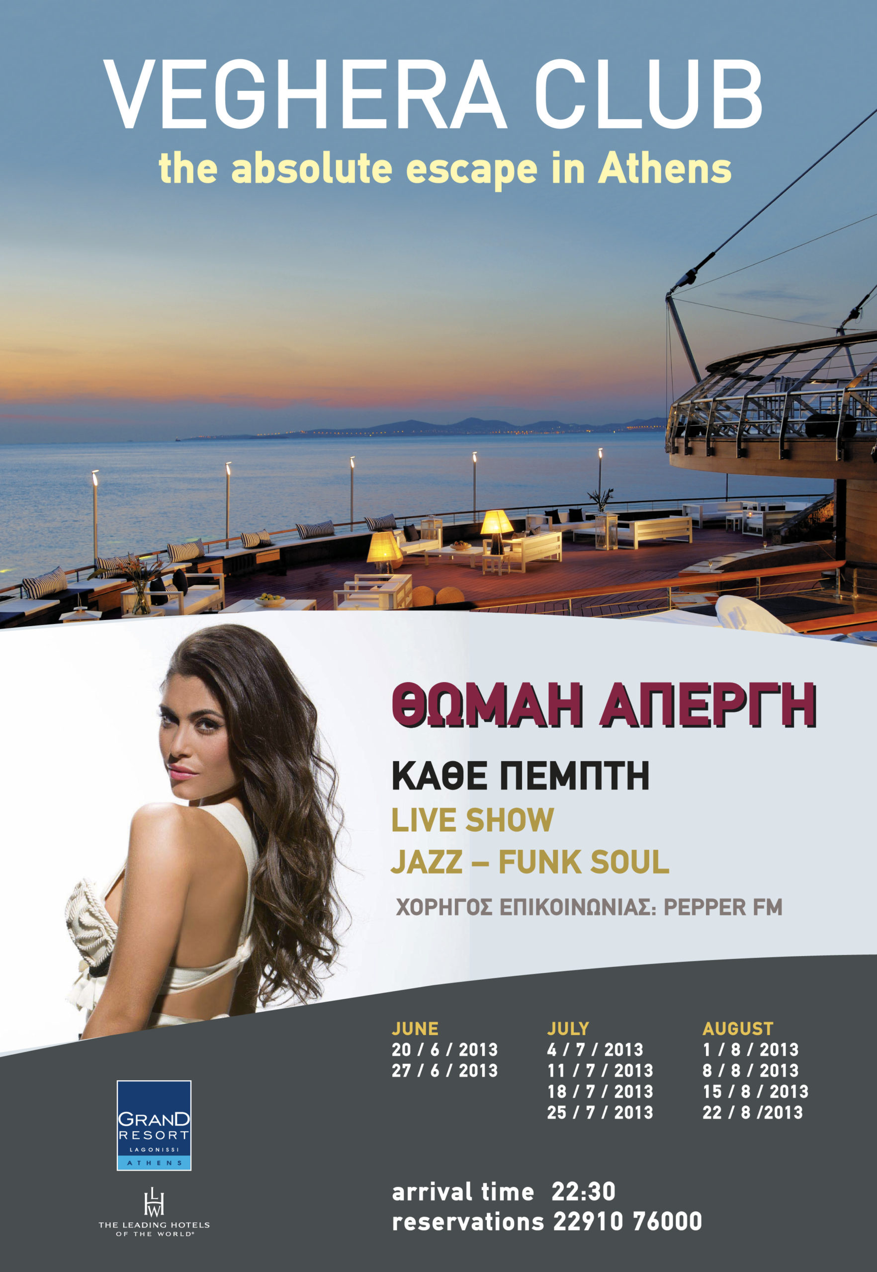 Από την Πέμπτη 20 Ιουνίου το Veghera Club που βρίσκεται στο ξενοδοχείο Grand Resort Lagonissi, η πραγματική απόδραση στην Αθήνα, φιλοξενεί την μοναδική στο είδος της, Θωμαή Απέργη για μια σειρά από live εμφανίσεις με φόντο την θάλασσα.