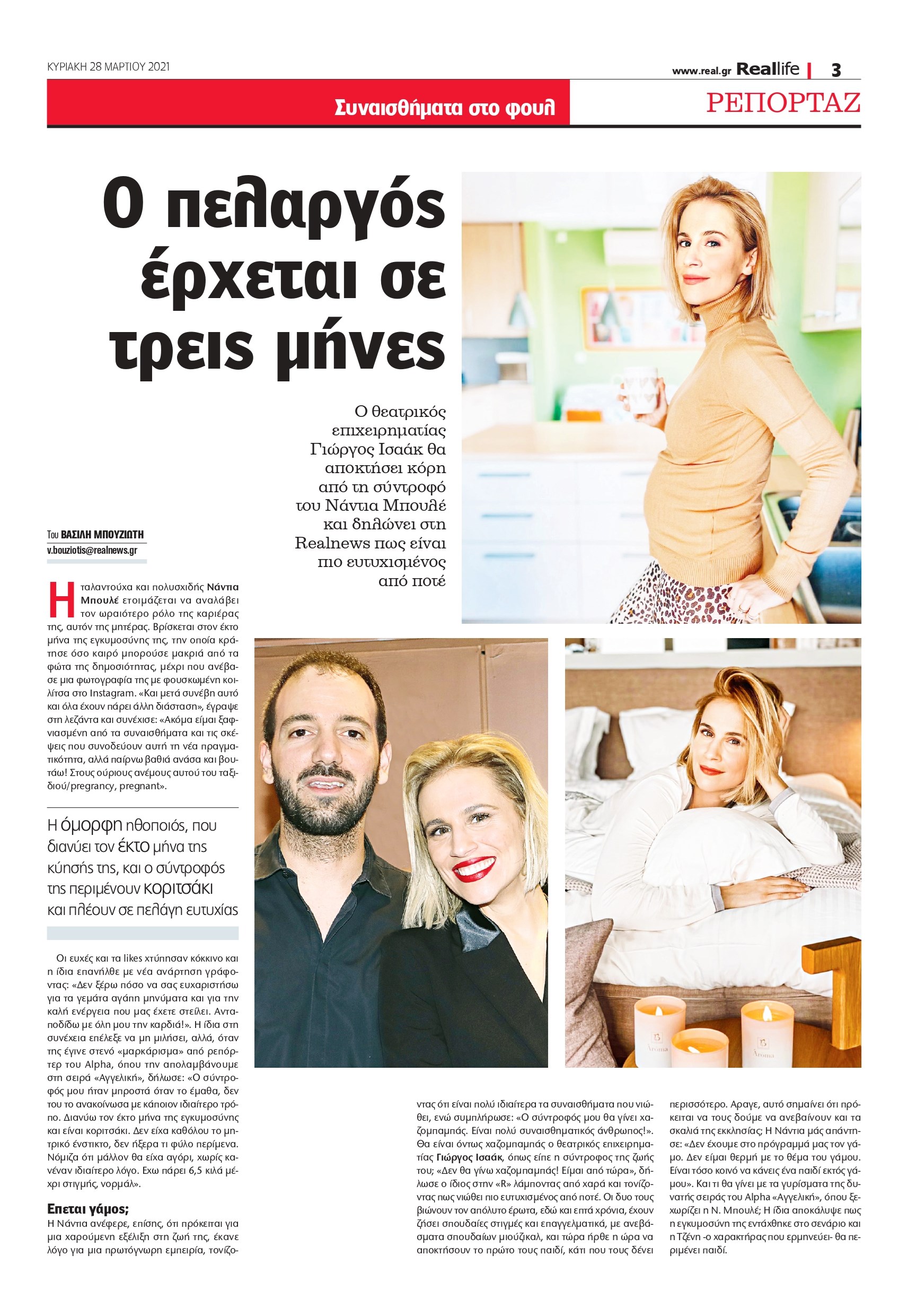 Η Νάντια ανέφερε, επίσης, ότι πρόκειται για μια χαρούμενη εξέλιξη στη ζωή της, έκανε λόγο για μια πρωτόγνωρη εμπειρία, τονίζοντας ότι είναι πολύ ιδιαίτερα τα συναισθήματα που νιώθει, ενώ συμπλήρωσε: «Ο σύντροφός μου θα γίνει χαζομπαμπάς. Είναι πολύ συναισθηματικός άνθρωπος!». Θα είναι όντως χαζομπαμπάς ο θεατρικός επιχειρηματίας Γιώργος Ισαάκ, όπως είπε η σύντροφος της ζωής του; «Δεν θα γίνω χαζομπαμπάς! Είμαι από τώρα», δήλωσε ο ίδιος στην «R» λάμποντας από χαρά και τονίζοντας πως νιώθει πιο ευτυχισμένος από ποτέ.