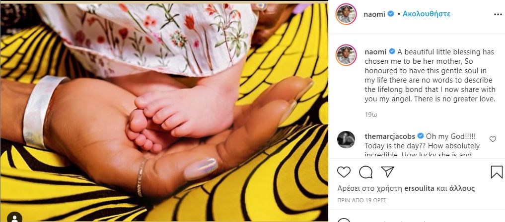 Η Ναόμι Κάμπελ με ανάρτηση που έκανε στον προσωπικό λογαριασμό της στο Instagram την Τρίτη έκανε γνωστό ότι έγινε μητέρα. Η ‘μαύρη γαζέλα’ της μόδας δημοσίευσε μία φωτογραφία στην οποία φαίνεται να κρατά τα ποδαράκια της κόρης της και έγραψε: “Μια όμορφη μικρή ευλογία επέλεξε εμένα να γίνω μητέρα της. Τιμή μου να έχω αυτήν την ψυχούλα στη ζωή μου, δεν υπάρχουν λόγια να περιγράψω τον ισόβιο δεσμό που μοιράζομαι μ’ εσένα άγγελέ μου. Δεν υπάρχει μεγαλύτερη αγάπη”.