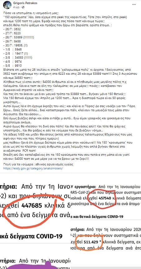 Συγκεκριμένα έγραψε: «Πόσο να υποτιμάται η νοημοσύνη μας; “150 κρούσματα” λέει, όσα είχαμε στο peak της καραντίνας. Τότε (τον Απρίλη, στο peak) κάναμε 1200 τεστ τη μέρα. Έψαξε κανείς σας πόσα τεστ κάνουμε τώρα; Επειδή θέλει πολύ ψάξιμο και πράξεις που ξέρω ότι βαριέστε, ορίστε έτοιμο: