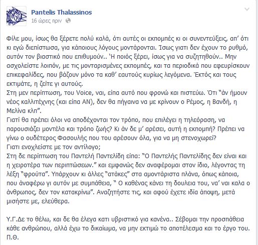 Μετά από τις δηλώσεις του Παντελή Θαλασσινού σχετικά με το “The Voice”, αλλά και την έντονη αντίδραση του Αντώνη Ρέμου, πολλοί ήταν εκείνοι που τάχθηκαν κατά του ερμηνευτή. Ο τραγουδοποιός απάντησε εκ νέου μέσα από την επίσημη σελίδα του στο facebook γράφοντας: