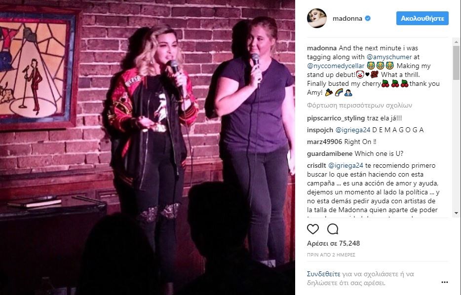 Σύμφωνα με ανάρτησή της στο Instagram, η «βασίλισσα της ποπ» αποφάσισε να ξεκινήσει και το stand up comedy. Ανέβηκε, μάλιστα, στη σκηνή μαζί με τη την γνωστή και επιτυχημένη κωμικό, Έιμι Σούμερ στο Comedy Cellar.