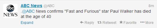 “Επιβεβαιώνεται πως ο ηθοποιός των “Fast and Furious”, Πoλ Γουόκερ, πέθανε στην ηλικία των 40 ετών.”