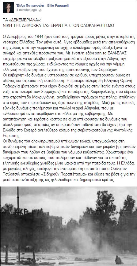 Νέα παρέμβαση από την ΟΝΝΕΔίτισσα, Έλλη Παπαγγελή, η οποία με ανάρτηση στον προσωπικό της λογαριασμό στο Facebook σχολιάζει τα Δεκεμβριανά και κάνει λόγο για πραξικόπημα του ΕΑΜ-ΕΛΑΣ που απέτυχε μετά την νίκη των κυβερνητικών δυνάμεων.