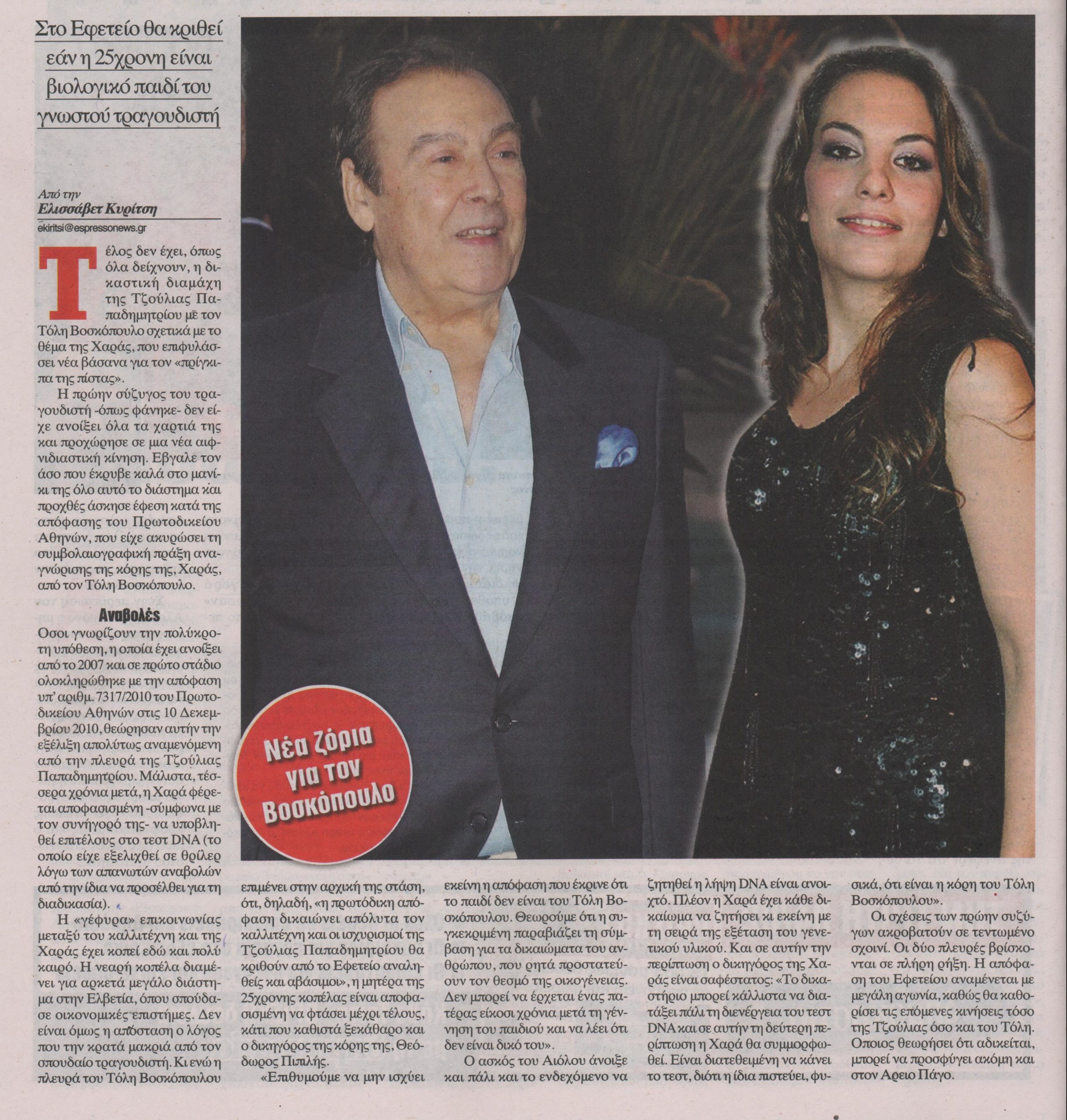 Η πρώην σύζυγος του τραγουδιστή -όπως φάνηκε- δεν είχε ανοίξει όλα τα χαρτιά της και προχώρησε σε μία νέα αιφνιδιαστική κίνηση. Έβγαλε τον άσο που έκρυβε καλά στο μανίκι της όλο αυτό το διάστημα και προχθές άσκησε έφεση κατά της απόφασης του Πρωτοδικείου Αθηνών, που είχε ακυρώσει τη συμβολαιογραφική πράξη αναγνώρισης της κόρης της, Χαράς, από τον Τόλη Βοσκόπουλο.