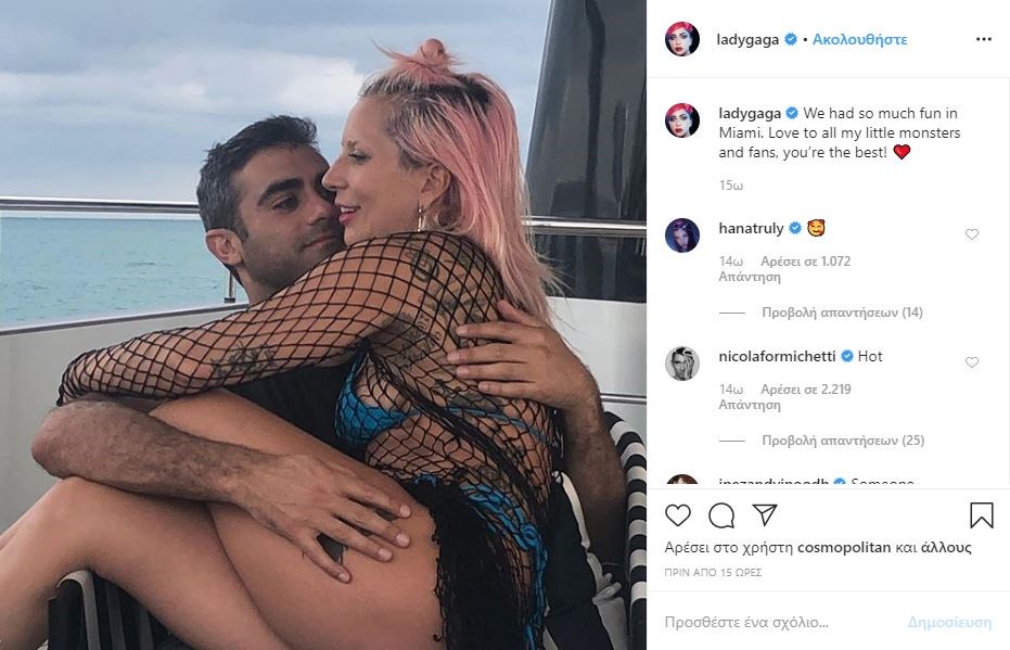H Lady Gaga ποζάρει με τον αγαπημένο της σε σκάφος ενώ φεύγει από το Μαϊάμι. Εκείνος την κοιτάζει με λατρεία και εκείνη δείχνει χαλαρή στην αγκαλιά του.