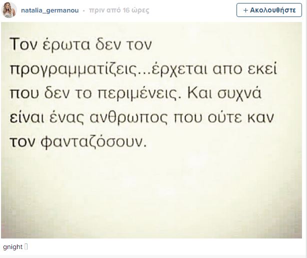 “Τον έρωτα δεν τον προγραμματίζεις… Έρχεται από εκεί που δεν το περιμένεις. Και συχνά είναι ένας άνθρωπος που ούτε καν τον φανταζόσουν” έγραψε χαρακτηριστικά η Ναταλία Γερμανού και με αυτή την ανάρτηση καληνύχτισε τους διαδικτυακούς της φίλους, αφήνοντάς τους με την… απορία!