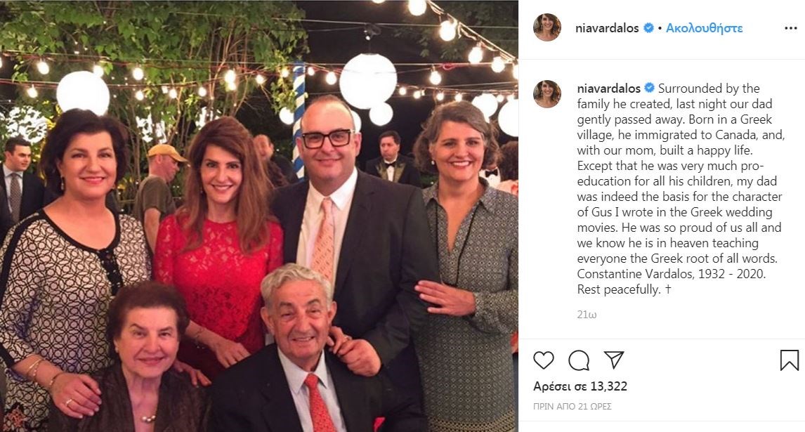 Δύσκολες ώρες περνά η Nia Vardalos, η αγαπημένη ηθοποιός ελληνικής καταγωγής [που έγινε παγκοσμίως γνωστή από τις ταινίες ¨Μy big fat greek wedding», καθώς έφυγε από τη ζωή ο πατέρας της . Το δυσάρεστο γεγονός ανακοίνωσε η ίδια η Νία Βαρντάλος μέσω instagram. Η ηθοποιός δημοσίευσε μια οικογενειακή φωτογραφία και έγραψε το εξής μήνυμα για τον θάνατο του πατέρα της:”Έχοντας γύρω του την οικογένεια την οποία δημιούργησε, χθες βράδυ ο μπαμπάς μας πέθανε ήρεμα. Γεννημένος σε ένα ελληνικό χωριό, μετανάστευσε στον Καναδά και μαζί με την μαμά μου, έφτιαξαν μια ευτυχισμένη ζωή. Ο πατέρας μου ήταν η έμπνευση για να φτιάξω τον χαρακτήρα του Γκας, για τις ταινίες μου. Ήταν τόσο περήφανος για όλους εμάς και ξέρουμε ότι είναι στον παράδεισο και διδάσκει σε όλους την ελληνική ρίζα, όλων των λέξεων. Κωνσταντίνος Βαρδάλος 1932 -2020. Αναπαύσου εν ειρήνη”.