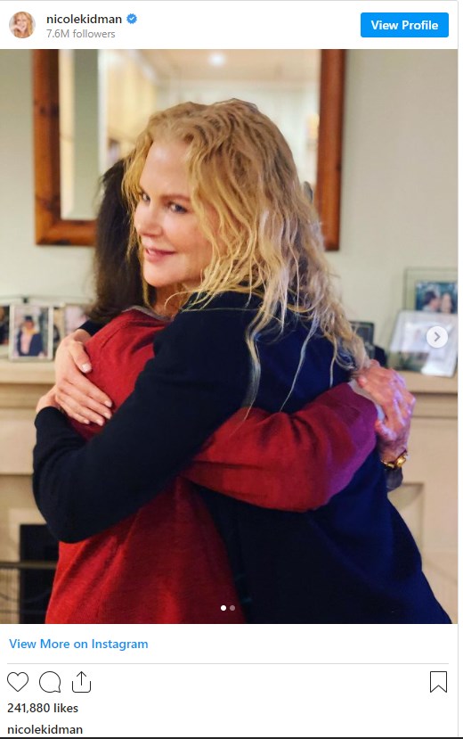 Στη φωτογραφία που ανέβασε, η Κίντμαν χαμογελαστή αγκαλιάζει σφιχτά την αγαπημένη της μητέρα και συνοδεύει τη φωτογραφία με το εξής σχόλιο: