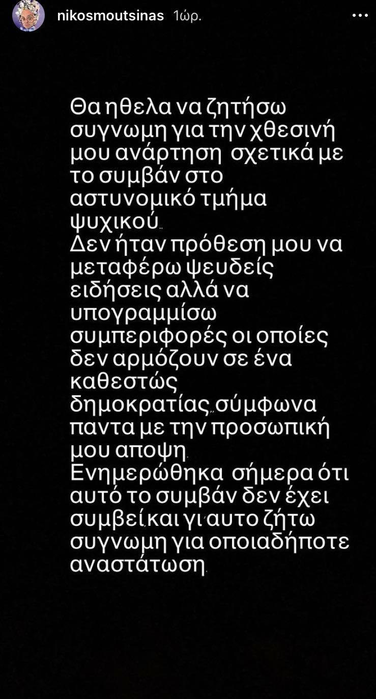 «Θα ήθελα να ζητήσω συγγνώμη για την χθεσινή μου ανάρτηση σχετικά με το συμβάν στο αστυνομικό τμήμα Ψυχικού. Δεν ήταν πρόθεσή μου να μεταφέρω ψευδείς ειδήσεις αλλά να υπογραμμίσω συμπεριφορές οι οποίες δεν αρμόζουν σε ένα καθεστώς δημοκρατίας, σύμφωνα πάντα με την προσωπική μου άποψη. Ενημερώθηκα σήμερα ότι αυτό το συμβάν δεν έχει συμβεί γι’ αυτό ζητώ συγγνώμη για οποιαδήποτε αναστάτωση», έγραψε ο Νίκος Μουτσινάς.