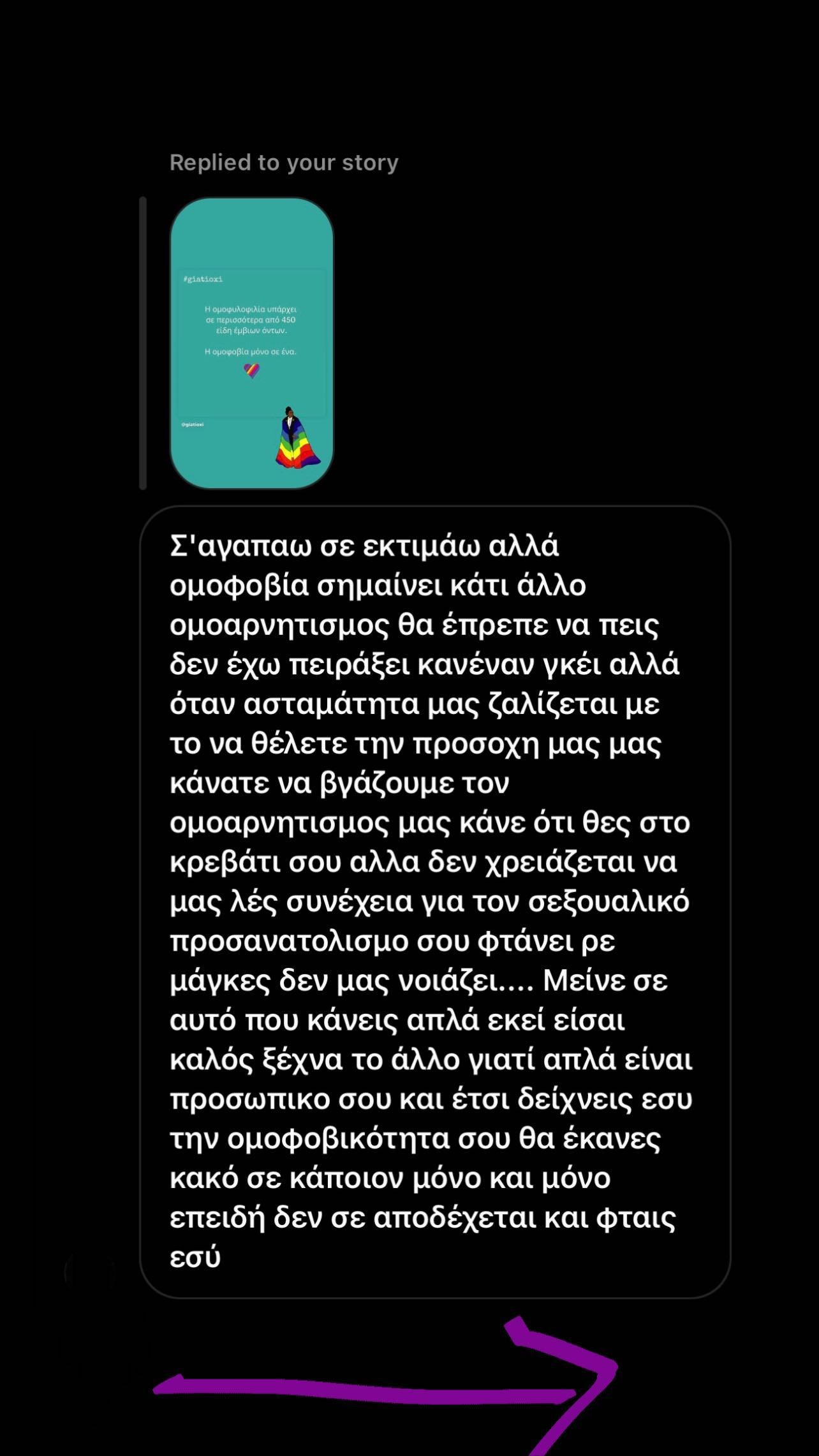 Ο γνωστός παρουσιαστής ωστόσο θέλησε να ξεκαθαρίσει τη θέση του έπειτα από ένα μήνυμα που έλαβε από follower του, το οποίο έλεγε τα εξής: “Σ’ αγαπώ σε εκτιμώ αλλά ομοφοβία σημαίνει κάτι άλλο. Ομοαρνητισμός έπρεπε να πεις. Δεν έχω πειράξει κανέναν γκέι αλλά όταν ασταμάτητα μας ζαλίζεται με το να θέλετε την προσοχή μας, μας κάνετε να βγάζουμε τους ομοαρνητισμούς μας. Κάνε ότι θες στο κρεβάτι σου αλλά δε χρειάζεται να μας λες συνέχεια για τον σεξουαλικό σου προσανατολισμό. Φτάνει ρε μάγκες, δε μας νοιάζει. Μείνε σε αυτό που κάνεις απλά, εκεί είσαι καλός, ξέχνα το άλλο γιατί απλά είναι προσωπικό σου και έτσι δείχνεις εσύ την ομοφοβικότητά σου. Θα έκανες κακό σε κάποιον μόνο και μόνο επειδή δε σε αποδέχεται και φταις εσύ”.