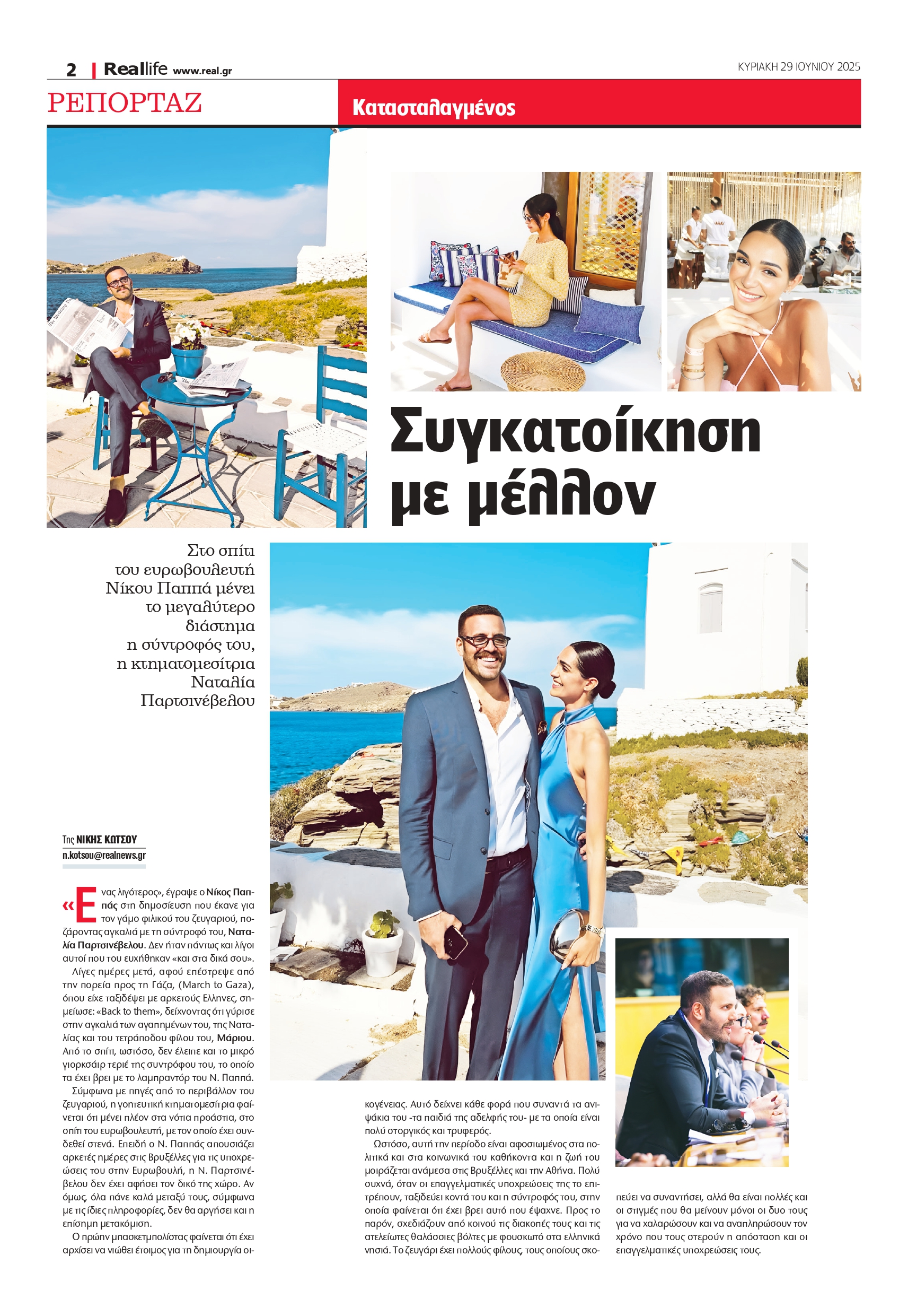 Σύμφωνα με πηγές από το περιβάλλον του ζευγαριού, η γοητευτική κτηματομεσίτρια φαίνεται ότι μένει πλέον στα νότια προάστια, στο σπίτι του ευρωβουλευτή, με τον οποίο έχει συνδεθεί στενά. Επειδή ο Ν. Παππάς απουσιάζει αρκετές ημέρες στις Βρυξέλλες για τις υποχρεώσεις του στην Ευρωβουλή, η Ν. Παρτσινέβελου δεν έχει αφήσει τον δικό της χώρο.