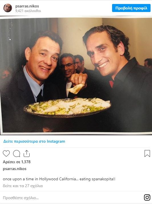 Ο γνωστός ηθοποιός Νίκος Ψαρράς κοινοποίησε στο instagram μια παλαιότερη φωτογραφία του με τον Τομ Χανκς, τότε που οι δύο τους στην Αμερική είχαν συναντηθεί και έτρωγαν μαζί από μια πιατέλα σπανακόπιτα.