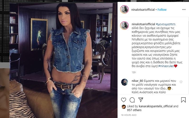 «#μενουμεσπιτι αλλά δεν ξεχνάμε να έχουμε τις καθημερινές μας συνήθειες που μας κάνουν να αισθανόμαστε όμορφα! Ντυθείτε με τα αγαπημένα σας ρούχα, κορίτσια φτιάξτε μαλλί, βάλτε μάσκαρα, κραγιόν (άντρες μην ξυρίζεστε και κουρεύεστε γουλί μας αρέσετε και ως ναυαγοί) και ζήστε τον εαυτό σας όπως επιτάσσει η ψυχή σας και η διάθεση θα δείτε πώς θα ανεβεί στα ύψη!!», έγραψε χαρακτηριστικά η Νίνα Λοτσάρη.