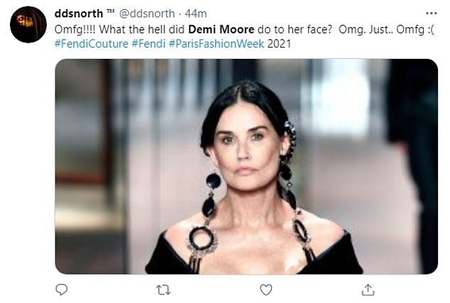 Από τη μεγάλη οθόνη στον χώρο της υψηλής μόδας. Μία εμφάνιση έκπληξη στην πασαρέλα του Fendi στο πλαίσιο της Εβδομάδας Μόδας στο Παρίσι έκανε η Ντέμι Μουρ αλλά δεν είχε την αναμενόμενη ανταπόκριση. Και αιτία ήταν το πρόσωπό της που έδειχνε… παραμορφωμένο. Η πασαρέλα αυτή ήταν η πρώτη για τον Κιμ Τζόουνς στη Fendi, ο οποίος είπε στη βρετανική Vogue ότι η κολεξιόν του αυτή ήταν μέρος του αφιερώματος σε δυνατές και έξυπνες γυναίκες που ξέρουν τι κάνουν στη ζωή τους.