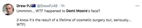 Αυτή, ωστόσο, δεν ήταν η πρώτη συνεργασία της Μουρ με τον Τζόουνς καθώς είχε ποζάρει και για ένα βιβλίο με πορτρέτα το 2019 φορώντας ένα κοστούμι σε δικό του σχέδιο. Στο σόου συμμετείχαν και κορυφαία μοντέλα όπως η Ναόμι Κάμπελ, η Κάρα Ντελεβίν και η Κρίστι Τέρλινγκτον. Αλλά το πρόσωπο της Μουρ ήταν αυτό που σχολιάστηκε εντονότερα στα social media όπου οι θαυμαστές της δεν μπορούσαν να μην αναφερθούν στη διαφορετική εικόνα της. Όλοι θεώρησαν ότι έκανε πλαστική επέμβαση που αλλοίωσε το πρόσωπό της σε μια προσπάθεια να σταματήσει τον χρόνο και αυτό σχολιάστηκε εντονότατα.