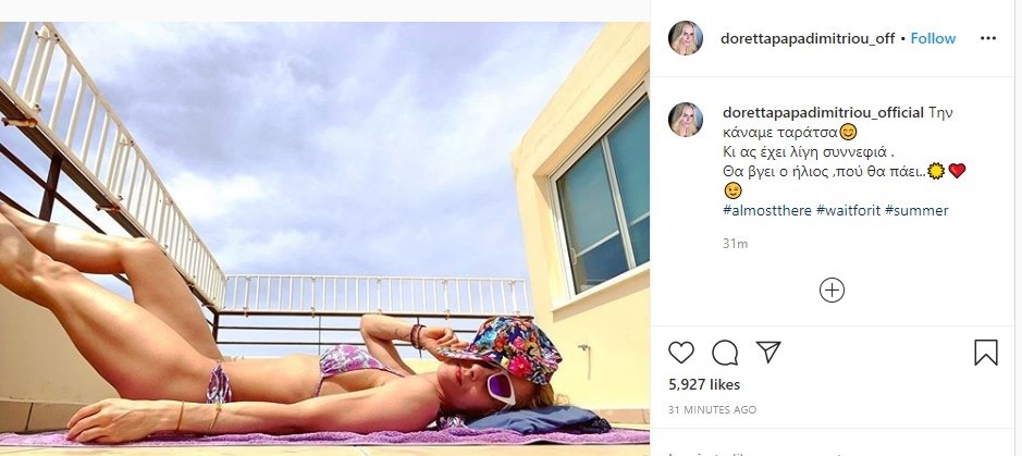 Η Ντορέττα Παπαδημητρίου ήταν αποφασισμένη να βάλει το μαγιό της και να κάνει ηλιοθεραπεία το Σάββατο. Έτσι, παρά την συννεφιά μιας και η θερμοκρασία έχει ανέβει αισθητά τις τελευταίες ημέρες, η γνωστή ηθοποιός φόρεσε το μπικίνι της και ανέβηκε στην ταράτσα του σπιτιού της για να απολαύσει όσο περισσότερο ήλιο μπορούσε.