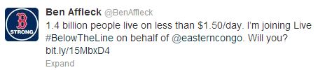 O δύο φορές βραβευμένος με όσκαρ σκηνοθέτης και ηθοποιός, Μπέν Άφλεκ, δεσμεύθηκε ότι θα ζήσει με 1,5 δολάριο την ημέρα στο πλαίσιο της εκστρατείας “Live Below The Line”, ώστε να ευαισθητοποιήσει την κοινή γνώμη για τη φτώχεια που πλήττει τον πλανήτη.