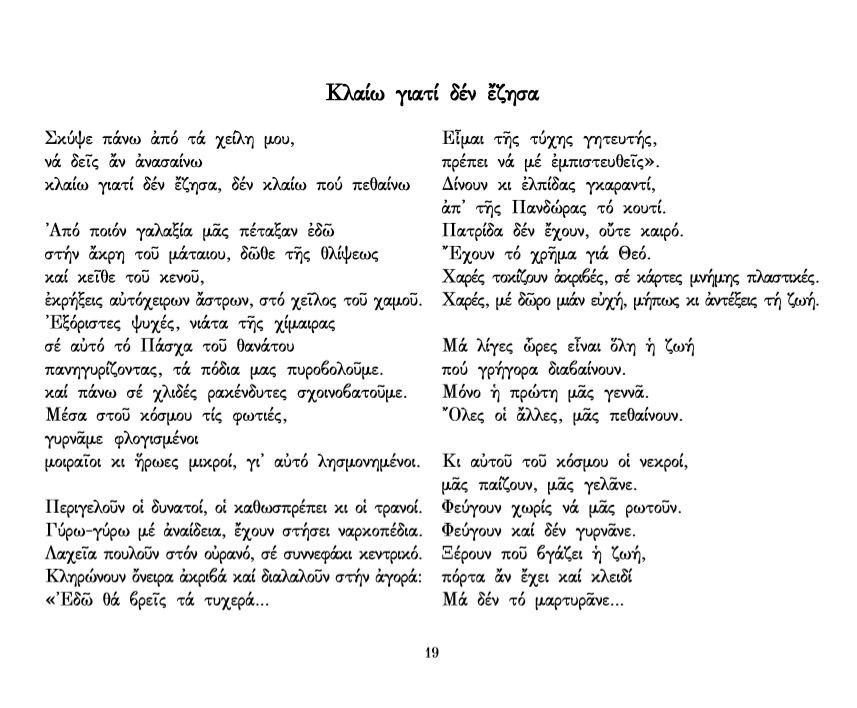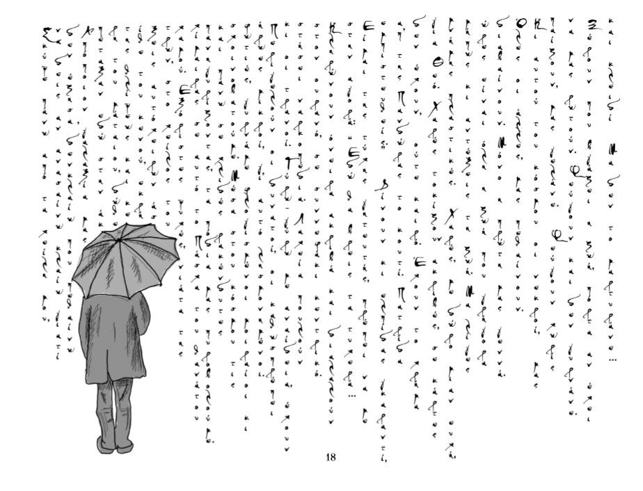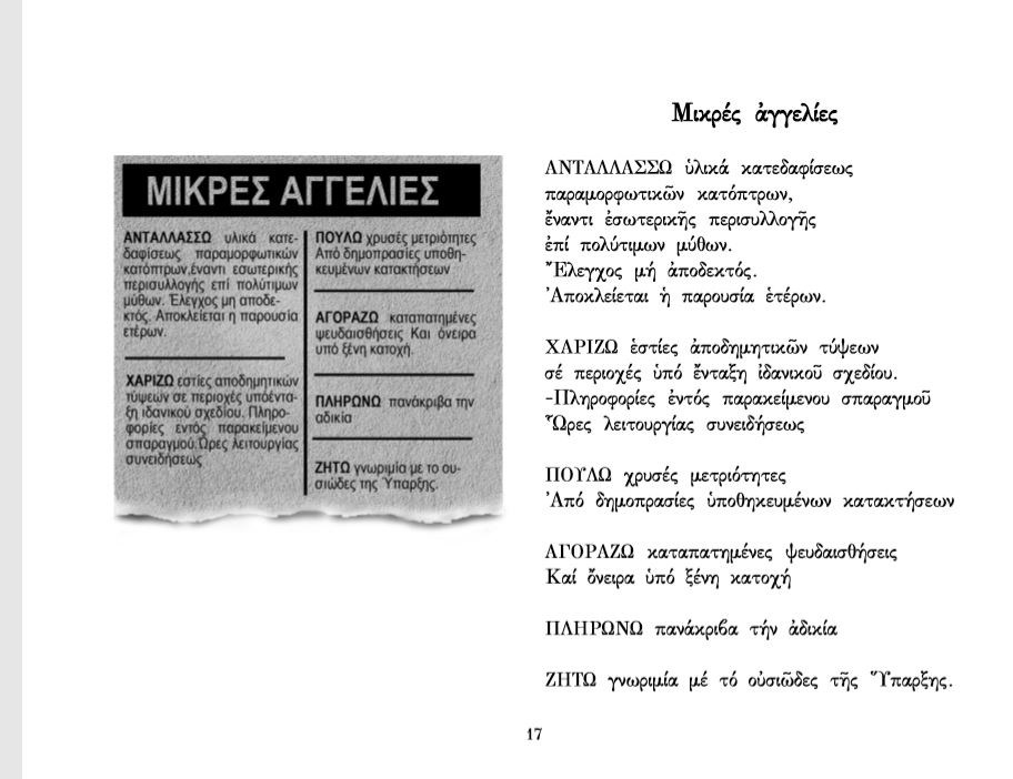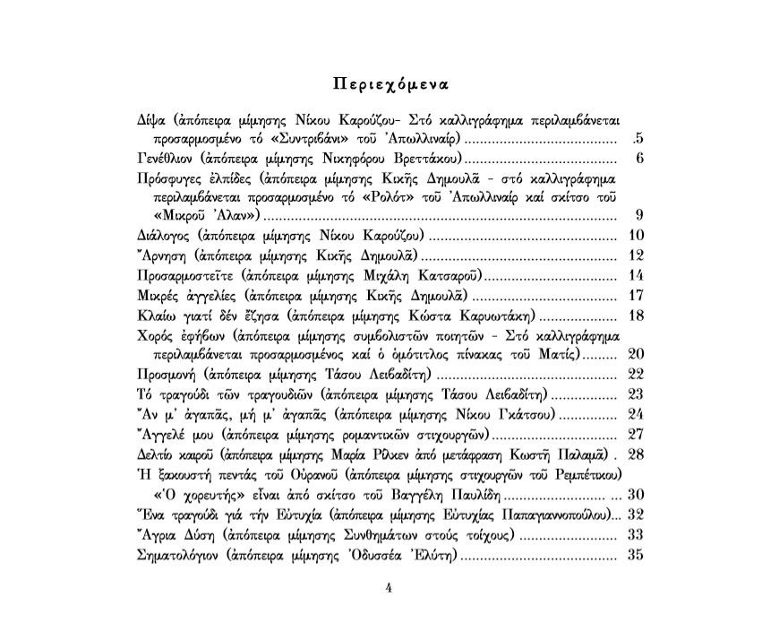Ένα εξαιρετικά πρωτότυπο έργο που περιλαµβάνει δεκαοχτώ ποιήµατα – τραγούδια γραµµένα µε τον τρόπο γνωστών ποιητών, από τον Βρεττάκο και τον Καρυωτάκη µέχρι τον Γκάτσο και τους ρεµπέτες και από τον Ελύτη και τον Καρούζο µέχρι τα συνθήµατα στους τοίχους της πόλης. Τα ποιήµατα συνοδεύουν ισάριθµα καλλιγραφήµατα, σχέδια και µορφές που είναι απολύτως συνυφασµένα µε τα ποιήµατα.