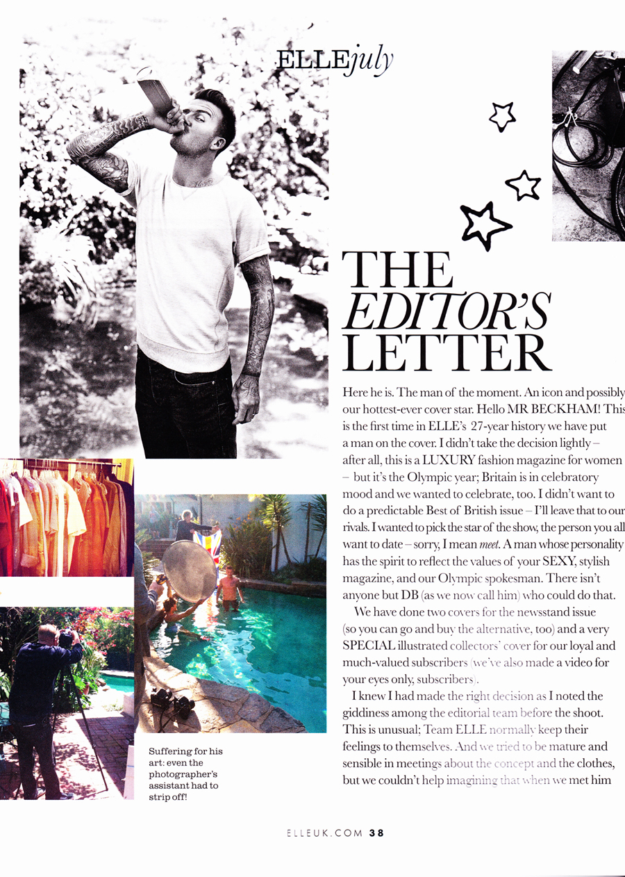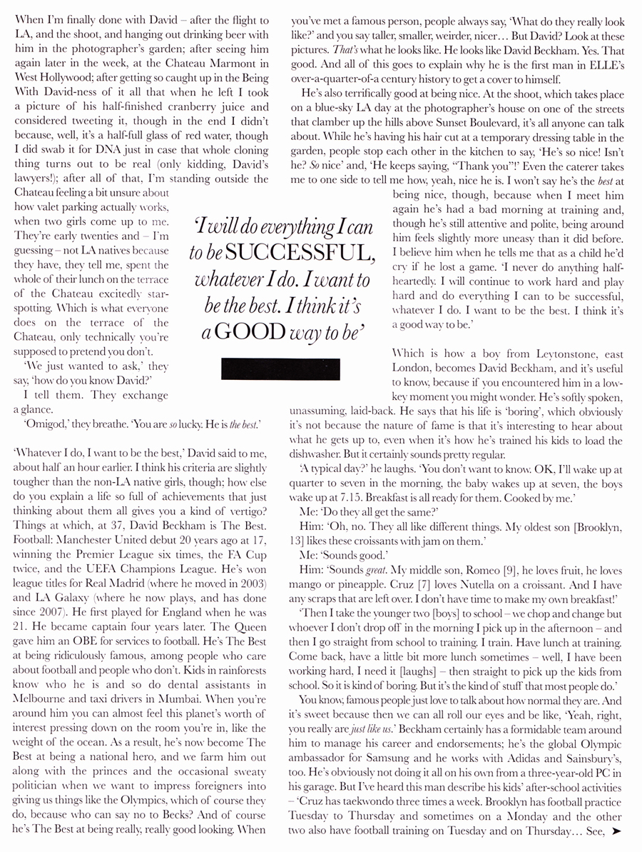 Στη φετινή, λαμπερή “ολυμπιακή χρονιά” της Μ.Βρετανίας, ο David Beckham είναι σίγουρα το πιο λαμπερό αστέρι του show, o αθλητής- πρότυπο, ο άντρας που όλες/οι θα ‘θελαν να συναντήσουν. “Ποτέ δεν κάνω κάτι με μισή καρδιά. Θα συνεχίσω να δουλεύω σκληρά και να παίζω σκληρά και θα κάνω τα πάντα για να πετύχω – οτιδήποτε και να ‘ναι αυτό που κάνω”, δηλώνει.” Θέλω να είμαι ο καλύτερος”. Και είναι. ‘Εχει μια ιλιγγιώδη καριέρα, μια προσωπική περιουσία που μεγαλώνει μέρα με τη μέρα, είναι ένα από τα πιο πολυφωτογραφημένα πρόσωπα του πλανήτη και βέβαια είναι πολύ καλός στο να “δείχνει” όπως δείχνει ο Beckham. Mε δυό λόγια, εξοργιστικά όμορφος. Δεν σκέφτηκε ποτέ του να αποσυρθεί ; “Ναι, υποθέτω πως θα μπορούσα εύκολα να το κάνω αυτό”, λέει στη συνέντευξη του στο “Elle”. “Θα ήταν εύκολο για μένα να αποσυρθώ ή για τη Victoria να μείνει σπίτι και να είναι σύζυγος και μαμά, αλλά είμαστε ακόμα πολύ νέοι… Δεν υπάρχει λόγος για να μην συνεχίσουμε…”΄Οχι πως έχει κανένα πλάνο για το τι θα κάνει από δω και πέρα. Θα ήθελε, λέει, να συνεχίσει να παίζει μπάλα, ίσως και να προπονήσει κάποια μέρα την Εθνική Αγγλίας για τους Ολυμπιακούς – αλλά ως εκεί. Ο David δουλεύει γιατί πολύ απλά αυτό κάνεις όταν είσαι κάποιος σαν τον Βeckham.