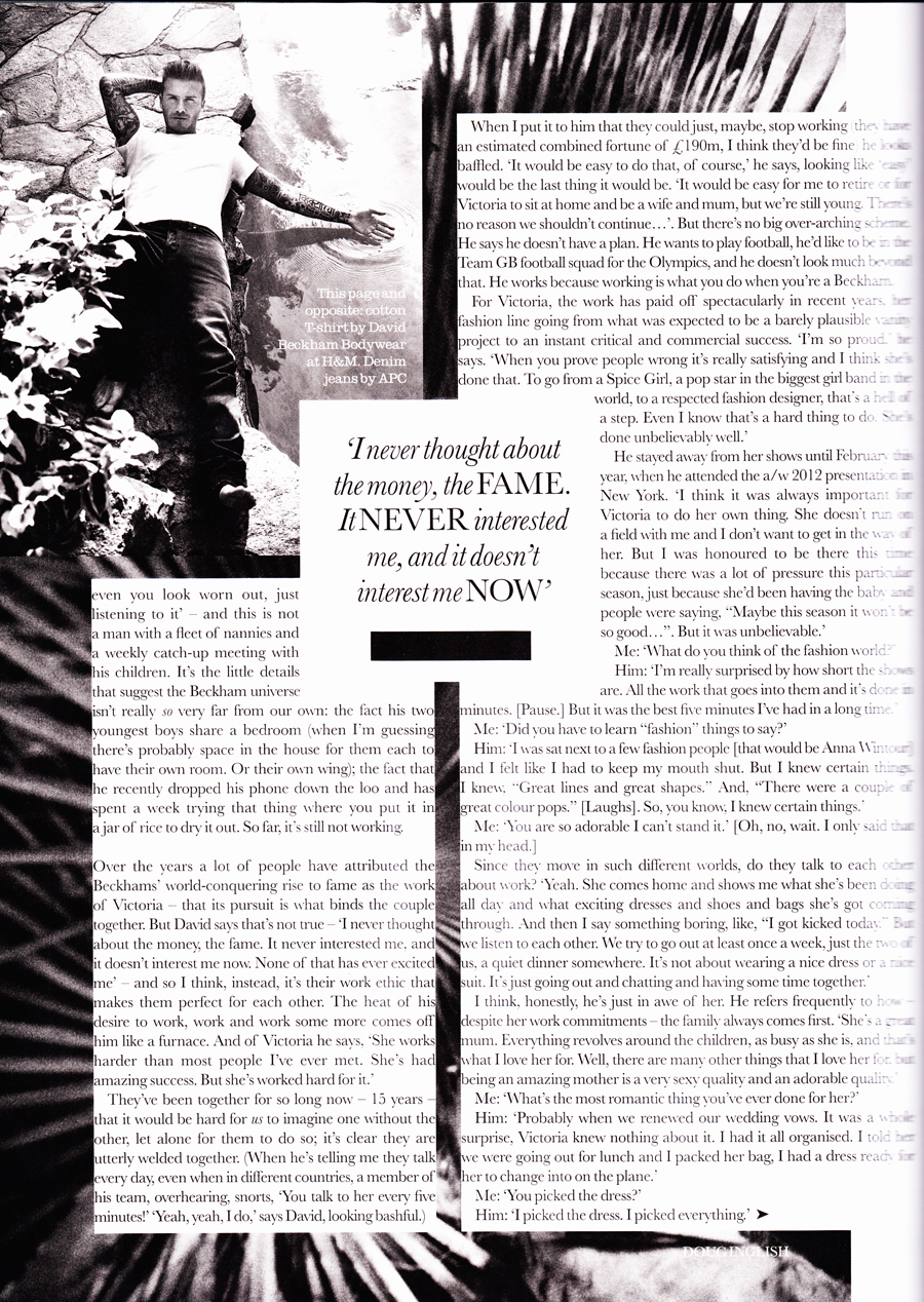 Κατά τα άλλα, επιμένει, έχει μια κανονική, ¨”μάλλον βαρετή”¨ζωή. Σηκώνεται κάθε μέρα στις επτά παρά τέταρτο. Το μωρό ξυπνάει στις επτά, τα αγόρια του στις επτά και τέταρτο. Ντύνονται και παίρνουν πρωινό – το ετοιμάζει ο ίδιος. ‘Οχι, δεν τρώνε όλοι τα πάντα, ο Brooklyn προτιμάει κρουασάν με μαρμελάδα, ο Romeo θέλει φρούτα, ο μικρός, ο Cruz, ψωμί με φουντουκόπαστα. Ο David τρώει συνήθως ό,τι περισσέψει – σπάνια έχει χρόνο να φτιάξει ένα κανονικό πρωινό για τον εαυτό του.”Μετά πηγαίνω τα αγόρια στο σχολείο – όποιον δεν προλάβω να πετάξω το πρωί, κανονίζω να τον πάρω το μεσημέρι – και από κει πάω στην προπόνηση. Προπονούμαι, τρώω ένα ελαφρύ γεύμα, μετά έρχομαι σπίτι, τρώω ακόμα λίγο και τρέχω να πάρω τα παιδιά από το σχολείο. Ε, εντάξει είναι λίγο βαρετά. Αυτό όμως δεν κάνει ο περισσότερος κόσμος;”Αυτό κάνει πάντως εκείνος και η Victoria – αν και oι κακές γλώσσες λένε, πως το ζευγάρι ασχολείται κυρίως με το κυνηγάει την επιτυχία. “Δεν είναι αλήθεια αυτό. Ποτέ δεν κυνήγησα τα χρήματα, τη φήμη. Ποτέ δεν με ενδιέφεραν και δεν με ενδιαφέρουν ούτε τώρα. Τίποτα απ’όλα αυτά δεν με ενθουσιάζει…” Η Victoria όμως – για την οποία μιλάει σχεδόν με δέος- είναι σίγουρα ένα από τα “θέματα” που τον κάνουν να λάμπει : “Δουλεύει σκληρά, πολύ πιο σκληρά απ’οποιονδήποτε έχω συναντήσει. Έχει τεράστια επιτυχία, αλλά δούλεψε πολύ σκληρά γι’αυτό. Και είναι καταπληκτική μαμά. Δίνει πάντα προτεραιότητα στα παιδιά, όσο απασχολημένη κι αν είναι, κι αυτό είναι ένα από τα πράγματα που αγαπάω σε κείνη. Δηλαδή, είναι πολλά τα πράγματα που αγαπώ, αλλά το να είναι καλή μαμά, είναι μια ιδιότητα πολύ σέξι και πολύ αξιαγάπητη”Ακριβώς αυτό που είχαμε κι εμείς στο μυαλό μας κοιτάζοντας αυτές τις φωτογραφίες David….