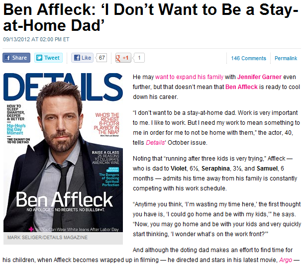 Ο Ben Affleck φιγουράρει στο εξώφυλλο του περιοδικού “Details” στο τεύχος Οκτωβρίου. Ο 40χρονος ηθοποιός δηλώνει πως παρόλο που θέλει να μεγαλώσει κι άλλο την οικογένεια του με την Jennifer Garner, αυτό δεν σημαίνει πως είναι έτοιμος να «παγώσει» την καριέρα του.«Δεν θέλω να είμαι ένας μπαμπάς που μένει σπίτι. Η δουλειά είναι πολύ σημαντική για μένα. Μου αρέσει να εργάζομαι, αλλά πρέπει η δουλειά να είναι αξιόλογη για να αποχωριστώ την οικογένεια μου» δήλωσε ο Ben Affleck στην συνέντευξη του. Στη συνέχεια ανέφερε πως είναι πολύ κουραστικό να τρέχει πίσω από τα τρία του παιδιά και ότι η σύζυγος του έχει περισσότερο υπομονή από εκείνον.Ωστόσο ο ηθοποιός του Χόλιγουντ βιώνει ένα ψυχολογικό δίλλημα: Όταν είναι σε γύρισμα ταινίας, σκέφτεται τα παιδιά του και ότι θα ήθελε να είναι σπίτι μαζί τους, ενώ όταν είναι σπίτι, αναρωτιέται τι γίνεται εκεί έξω στο Hollywood.