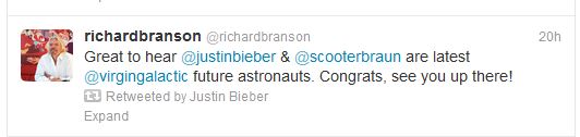 O Justin Bieber επιβεβαίωσε τις φήμες ότι θα ταξιδέψει στο διάστημα καθώς έκανε retweet την δήλωση του Richard Branson ότι χαίρεται που ο νεαρός τραγουδιστής θα γίνει αστροναύτης ταξιδεύοντας στο διάστημα με την αεροπορική του εταιρεία.
