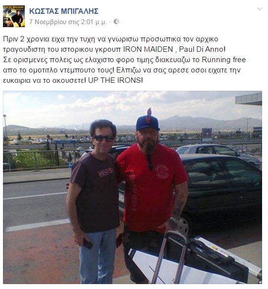 «Πριν 2 χρόνια είχα την τύχη να γνωρίσω προσωπικά τον αρχικό τραγουδιστή του ιστορικού γκρουπ IRON MAIDEN , Paul Di Anno! Σε ορισμένες πόλεις ως ελάχιστο φόρο τιμής διακευάζω το Running free από το ομότιτλο ντεμπούτο τους! Ελπίζω να σας άρεσε όσοι είχατε την ευκαιρία να το ακούσετε! UP THE IRONS!»