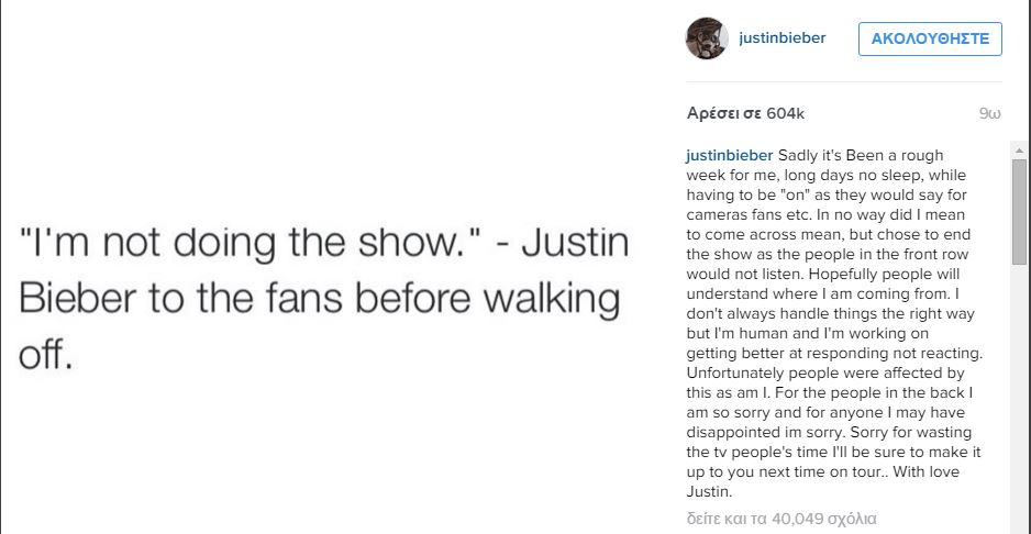 «Δυστυχώς ήταν μια δύσκολη εβδομάδα για εμένα, πολύ μεγάλες ημέρες χωρίς ύπνο ενώ έπρεπε να είμαι ανεβασμένος για τους θαυμαστές μου. Σε καμία περίπτωση δεν ήθελα να φανώ κακός, αλλά επέλεξα να σταματήσω τη συναυλία καθώς οι άνθρωποι στην πρώτη σειρά δεν με άκουγαν. Ελπίζω ο κόσμος να με καταλάβει. Δεν χειρίζομαι πάντα τα πράγματα με τον σωστό τρόπο αλλά είμαι άνθρωπος και εργάζομαι στο να βελτιώνω τις αντιδράσεις μου», έγραψε λίγο αργότερα απολογούμενος στο Instagram.