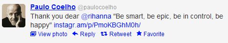 Aπίστευτο αλλά αληθινό! Ο λογοτέχνης Paolo Coelho ευχαριστεί μέσω twitter τη διάσημη τραγουδίστρια Rihanna…Γιατί; Η Rihanna ανέβασε στο λογαριασμό της ένα απόσπασμα του λογοτέχνη. Έγραψε: