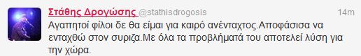 Ο τραγουδιστής Στάθης Δρογώσης ανήκει πλέον στην «οικογένεια» του ΣΥΡΙΖΑ. Το νέο γνωστοποίησε ο ίδιος μέσω του προσωπικού του λογαριασμού στo Twitter: