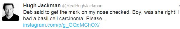 Ο Αυστραλός ηθοποιός Χιου Τζάκμαν εξέφρασε, μέσω του Instagram, την ανησυχία του για πιθανό καρκίνο του δέρματος, όταν οι γιατροί διέγνωσαν καρκινικά κύτταρα σε ένα σημάδι που εντόπισαν στη μύτη του.