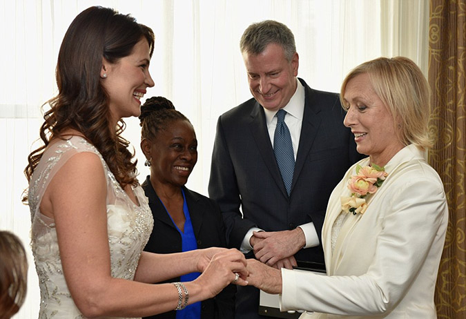 Οι δύο γυναίκες που είναι ζευγάρι από το 2006 ανέβηκαν τα σκαλιά της εκκλησίας στην Νέα Υόρκη σε μια σεμνή τελετή και υποσχέθηκαν η μία στην άλλη αιώνια αφοσίωση και αγάπη.