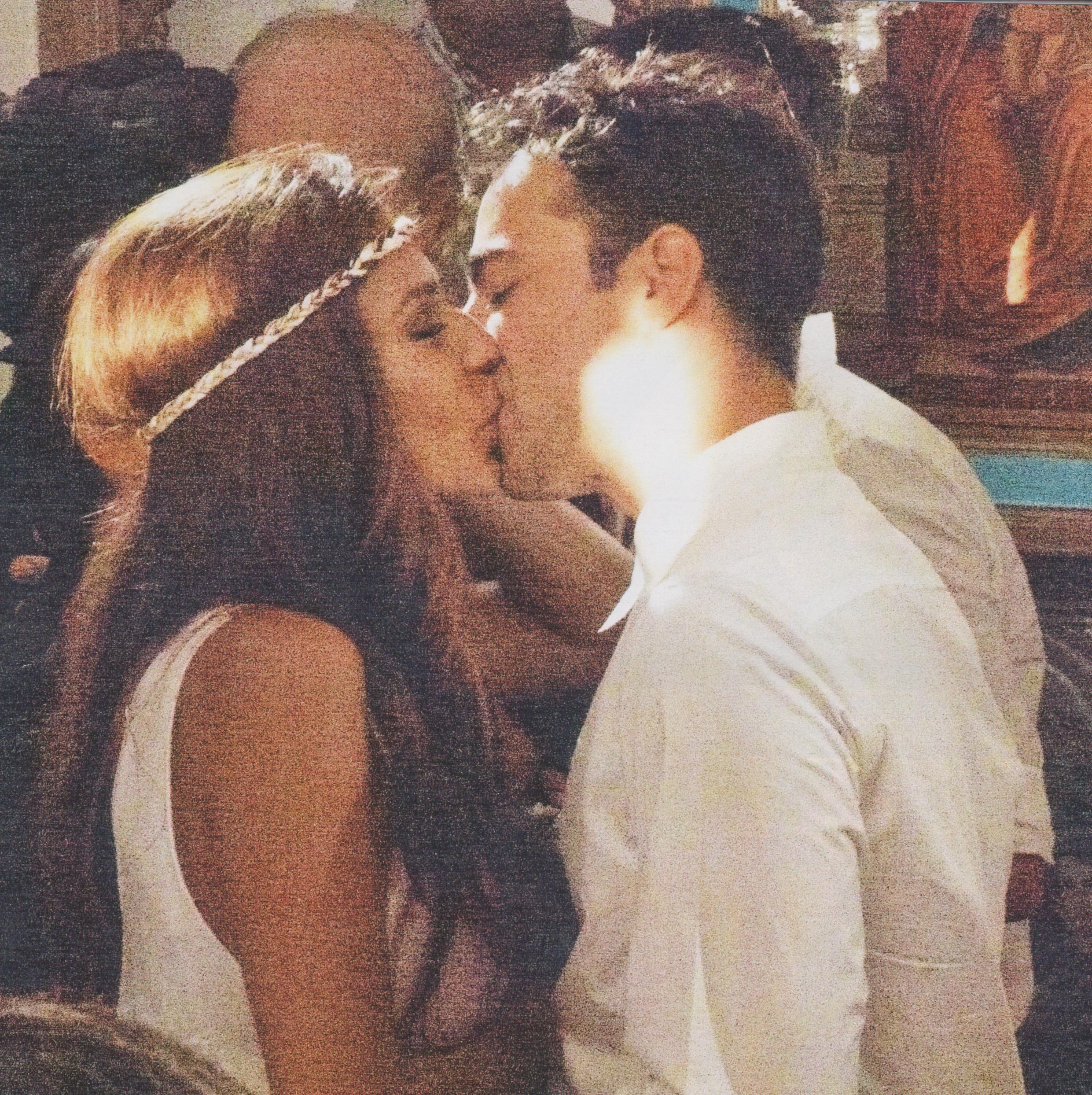 Η Κατερίνα, εμφανίστηκε στην εκκλησία, με ένα λιτό άσπρο φόρεμα, χρυσά σανδάλια, ενώ το μακιγιάζ της ήταν σε φυσικά χρώματα. Ο γαμπρός, αποφάσισε να ”αποχωριστεί” το μουστάκι του για την ημέρα του γάμου, και επέλεξε ένα γκρι παντελόνι με ένα άσπρο πουκάμισο.