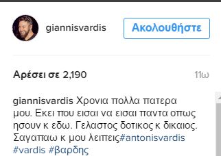 Με μια συγκινητική ανάρτηση, μέσω του προσωπικού του λογαριασμού στο Instagram ο Γιάννης Βαρδής τίμησε τη μνήμη του πατέρα του, Αντώνη, ανήμερα της «γιορτής του πατέρα».