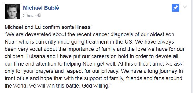 Δύσκολες ώρες περνά ο διάσημος τραγουδιστής Michael Bublé, καθώς ο τρίχρονος γιος του Noah, διαγνώστηκε με καρκίνο.