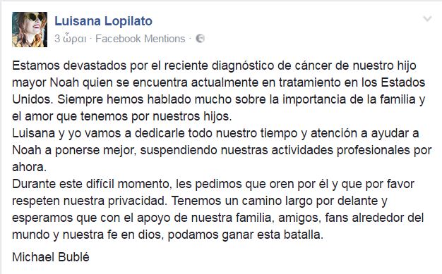 «Είμαστε συντετριμμένοι από την πρόσφατη διάγνωση που έδειξε πως ο μεγαλύτερος γιος μας έχει καρκίνο. Ήδη ξεκίνησε η θεραπεία του. Πάντα αναφερόμασταν στο πόσο σημαντική είναι η οικογένεια και στο πόσο αγαπάμε τα παιδιά μας. Θα αφήσουμε για την ώρα τις καριέρες μας στην άκρη με σκοπό να αφιερώσουμε όλον μας τον χρόνο και την προσοχή μας, για να βοηθήσουμε τον Noah να γίνει καλά. Σε αυτή τη δύσκολη στιγμή, ζητούμε μόνο τις προσευχές σας και να σεβαστείτε την ιδιωτική μας ζωή. Έχουμε ένα μεγάλο δρόμο μπροστά μας και ελπίζουμε πως με την υποστήριξη της οικογένειας, των φίλων και των θαυμαστών απ’όλο τον κόσμο, θα κερδίσουμε αυτήν τη μάχη, Θεού θέλοντος».