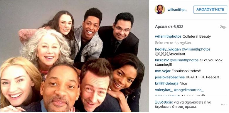 Ο Γουίλ Σμιθ φαίνεται πως έβαλε σκοπό να σπάσει το ρεκόρ που είχε σημειώσει πριν δύο χρόνια η selfie της Έλεν Ντε Τζένερις, στα Όσκαρ, και αυτή τη στιγμή η φωτογραφία του με τους υπόλοιπους συντελεστές της ταινίας «Collateral Beauty» σαρώνει στο διαδίκτυο.