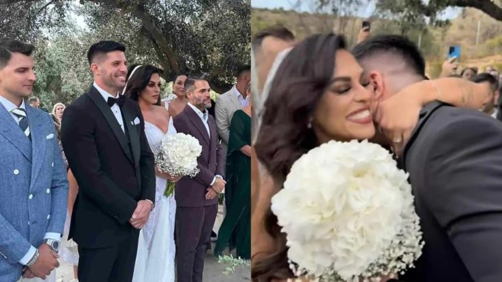 Ο γαμπρός φόρεσε κλασικό κοστούμι με παπιγιόν, ενώ η νύφη εντυπωσίασε με το λευκό της νυφικό σε ίσια γραμμή, διακοσμημένο με λεπτά κεντήματα και πέπλο.
