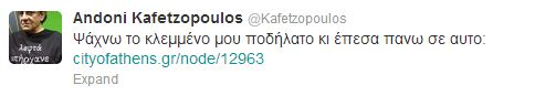 Ο Αντώνης Καφετζόπουλος έπεσε θύμα κλοπής, αφού εξαφανίστηκε το ποδηλατό του.Το έγραψε στο twitter του: