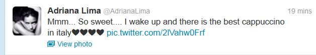 Η Αντριάνα Λίμα ενημερώνει τους followers της στο twitter ότι σήμερα ξύπνησε στην Ιταλία. Και απολαμβάνει τον καπουτσίνο της. Τον έβγαλε και φωτογραφία…